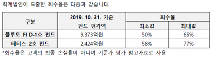 라임에 따르면 삼일회계법인으로부터 전달받은 모 펀드 '플루토 FI D-1호'와 '테티스 2호'의 예상 회수율은 각각 50∼65%, 58∼77%다. 라임은 신한금융투자, 한국투자증권, KB증권과 6800억원 규모의 TRS 계약을 맺었다. 이들 증권사는 계약상 펀드 자산을 처분할 경우 우선해서 자금을 회수할 수 있다. 일반 투자자는 뒷전으로 밀린다는 얘기다. 대부분 투자자는 라임 펀드 계약 당시 "TRS 내용과 위험 요소에 대해 듣지 못했다"고 주장하고 있다.