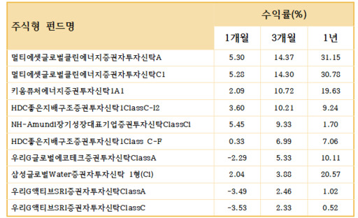 키움퓨처에너지증권투자신탁1A1와 HDC좋은지배구조증권투자신탁1은 같은 기간 각각 10.72%, 10.21%의 수익률을 냈다. 이 기간 10% 이상 수익률을 보인 펀드만 4곳에 달한다.