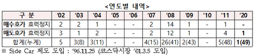 한국거래소가 유가증권시장 매도 사이드카를 발동했다. 올해 처음이고, 지난 2011년 이후 9년 만이다.
