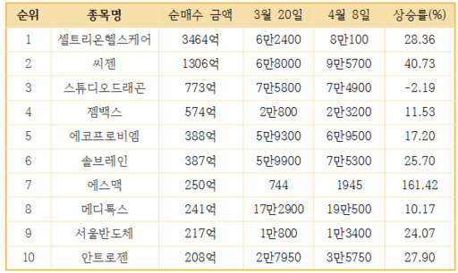 실제로 시장에서는 바이오 열풍이 불고 있다. 최근 한 달간 코스닥 시장에서 개인 순매수 상위 10개 종목을 살펴보면 씨젠, 셀트리온헬스케어, 젬백스 등 바이오 업체가 7개에 달했다. 글로벌 바이오 기업 전반에 코로나19 치료제에 대한 기대감이 반영되며 바이오주를 다시 사들인 것으로 풀이된다. 이는 코스닥 지수 상승에 직결됐다.