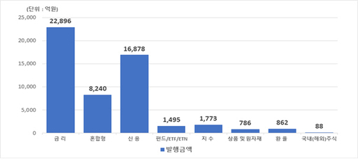 기초자산별로는 금리연계 DLS 발행금액이 2조2896억원으로 전체 발행금액의 43.2%를 차지했다. 발행금액은 전 분기보다 29.9% 감소했다.