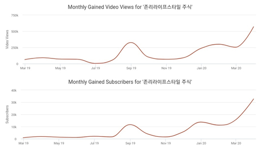 투자 전문가이자 유튜브 주식 스타로 떠오른 존 리 메리츠자산운용 대표 채널의 성장세는 더 가파르다. 최근 한달간 영상 업로드가 없었음에도 구독자와 조회수는 3월 이후 가파른 상승 곡선을 그리고 있다. 전체 구독자의 10%가 최근 한 달 새 유입된 인원이다.