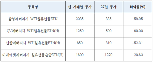 '신한레버리지 WTI원유선물 ETN(H)'(-52.31%)과 '미래에셋레버리지 원유선물혼합 ETN(H)'(-20.63%)도 동반 급락했다.