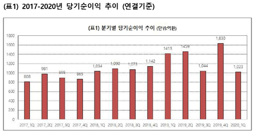 올해 1분기 영업이익과 세전이익은 1447억원, 1360억원을 기록하며 작년 같은 기간 대비 각각 12.8%와 30.4% 감소했다.