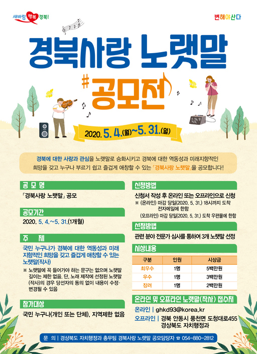 이번 '경북사랑 노랫말' 공모전은 코로나19로 지역 전반에 퍼진 침체된 분위기에서 벗어나 다시금 새바람 행복경북을 만들기 위한 범국민 애창곡을 만들기 위해 개최된다.