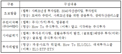 사회초년생 투자입문과 투자원칙을 주로 다루는'Lv1. 초보 탈출', 주식투자의 올바른 접근법을 제시하는'Lv2. 주린이극뽁', 생동감 넘치는 사례와 글로벌 시장을 소개하는'Lv3. 시야 넓히기', 최근 문제되는 파생결합상품과 사모펀드를 포함한 대체투자를 알아보는 'Lv4. 투자 레벨업'으로 구성되어 있어, 이용자의 수준과 선호에 따라 쉽게 이용할 수 있다.