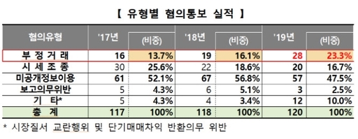 유형별로 살펴보면 미공개정보이용이 57건(47.5%)으로 절반에 달했다. 부정거래(23.3%), 시세조종(16.7%), 기타(10.0%), 보고의무위반(2.5%) 등이 뒤를 이었다. 부정거래는 2017년 16건에 불과했으나 2018년 19건(16.1%)으로 늘어나더니 지난해 28건(23.3%)으로 크게 증가했다.