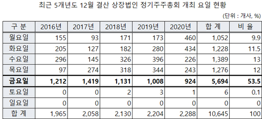 올해 3월 마지막 주에 전체 상장사의 82.6%가 주총을 개최했다. 2016년 77.0%보다 쏠림현상이 늘었다. 올해는 신종 코로나바이러스 감염증(코로나19) 이슈로 주총 일정 조정일이 불가피했다고 하지만 2019년에는 해당기간 전체 상장사의 90.4%가 주총을 개최했다.