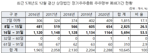 특히 주주명부 폐쇄기간이 15일 이하인 회사 비중은 2015년 40%에서 2018년 44.1%, 2020년 46.5%로 폐쇄기간이 단축되고 있다.
