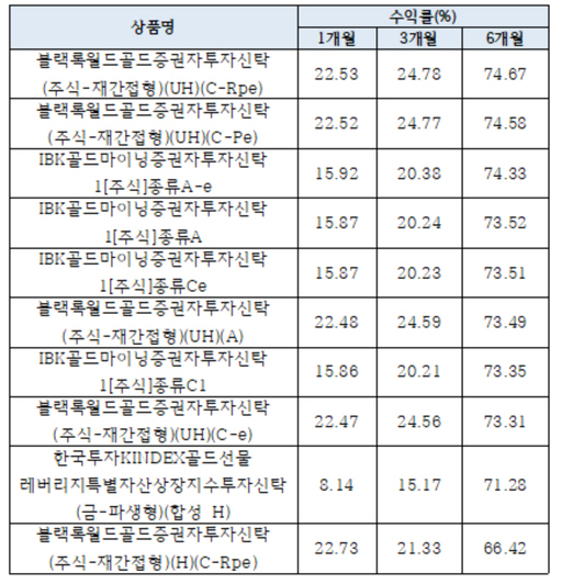 상품별로 살펴보면 금 관련 기업의 주식을 주로 편입한 재간접펀드의 수익률이 높았다. 블랙록월드골드증권자투자신탁(주식-재간접형)(UH)(C-Rpe)의 최근 한 달 수익률은 22.53%를 기록했다. 6개월 수익률은 43.81%, 1년 수익률은 74.67%에 달한다.