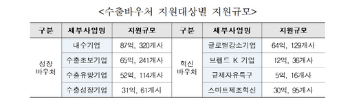 수출바우처 사업에 최종 선정된 기업들에게는 기업별 전년도 수출규모에 따라 3000만원에서 최대 1억원까지 수출바우처를 지급한다. 해당기업들은 지급된 바우처로 공인된 수행기관 등을 통해 국가별 수출전략, 디자인, 홍보, 전시회, 인증 등 수출 전 과정에서 필요한 다양한 해외마케팅 지원서비스를 바우처 한도 내에서 자유롭게 선택해 이용할 수 있다.
