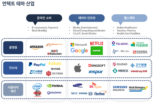 한화자산운용은 수혜 업종을 온라인 소비, 데이터인프라, 헬스케어 등 세가지 테마로 분류했다.