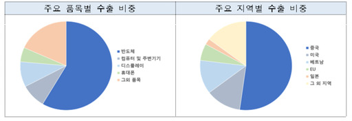지역별로는 중국은 반도체, 컴퓨터 및 주변기기 수출이 증가하면서 72억7000만 달러로 가장 높았다. 이어 미국 17억4000만 달러, 베트남 17억1000만 달러, 유럽연합 8억5000만 달러, 일본 3억 달러 순이었다.
