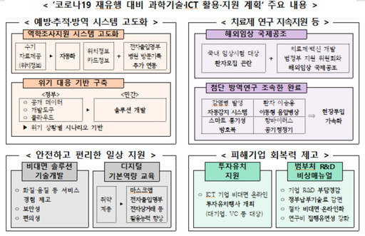 과기정통부는 '코로나19 재유행 대비 과학기술·ICT 기반 지원 계획'을 통해 그동안 코로나19 대응과정 중 시급한 대응이 필요한 과제를 발굴했다. ▲예방·추적·방역 시스템 고도화 ▲치료제 연구지원 및 첨단방역 기술 현장투입 가속화 ▲국민들의 안전하고 편리한 일상 지원 ▲피해기업 회복력 제고 등 4개 분야다.