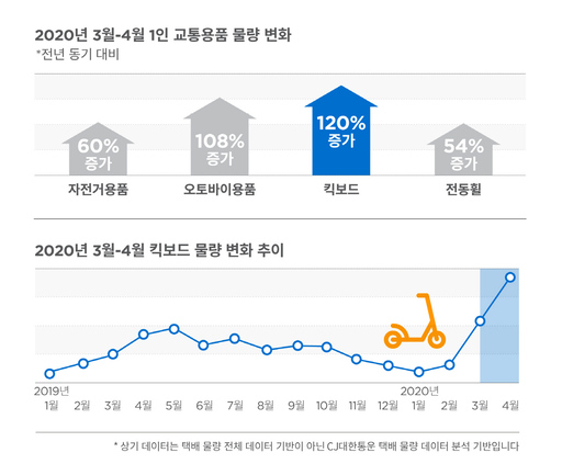 불특정 다수가 이용하는 대중교통 대신 '1인 교통수단'을 선택하는 현상 역시 택배를 통해 엿볼 수 있었다. 특히 킥보드는 전년 동기대비 120% 증가했으며, 3월 킥보드 물량은 고강도 거리두기 직전인 2월 대비 3배 이상 증가한 것으로 파악됐다. 자전거 용품(60%), 전동휠(54%) 배송도 늘었다.