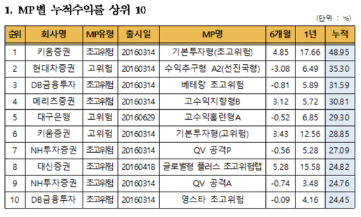누적 수익률이 가장 높은 MP는 48.95%를 기록한 키움증권 '기본투자형(초고위험)'이었고, 회사별 누적 평균 수익률은 메리츠증권이 15.66%로 가장 높았다.