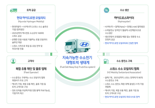 먼저 수소전기트럭 공급사인 현대 하이드로젠 모빌리티는 지난해 스위스 내 수소충전소 구축을 목적으로 총 21개의 글로벌 에너지사와 물류기업이 연합해 설립한 '스위스 수소 모빌리티 협회'에 파트너사로 참여하면서 수소 충전 부문과 전략적 협력관계를 맺었다.