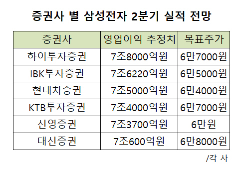 하이투자증권은 삼성전자가 2분기 영업이익 7조 8000억원을 기록할 것으로 전망, 가장 높은 추정치를 내놨다. 또 IBK투자증권은 7조6220억원, 현대차증권은 7조5000억원을 예상했다.