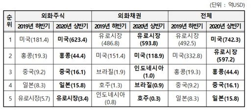 이 가운데 외화주식 관리금액은 227억5000만달러(약 27조4092억원)였고 외화채권 관리금액은 271억달러(약 32조6501억원)였다. 외화주식 관리금액은 작년 하반기 말보다 57.4% 늘었고, 외화채권 관리금액은 7% 줄었다.