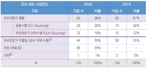 한편, ICFR 감사 도입 원년에 외부전문가를 활용한 기업의 비중이 한국 67%(자산총액 2조원 이상), 미국 70%로 유사한 수준이었지만 감사 적용 1년 후 외부전문가 활용 비중은 한국 36%, 미국 75%로 차이가 크게 벌어졌다. 다만, '미정(계획 중)'으로 답한 기업도 상당수(29%) 있어 올 하반기 외주 활용 비중이 상승할 것으로 예상된다.