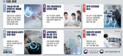 정부는 VR·AR 분야에서 규제체계를 정비·신설하거나 명확한 가이드라인을 제시하는 등 규제 불확실성을 해소하고, 금지되지 않은 것은 다 할 수 있도록 유연화한 규제 방식인 '포괄적 네거티브'를 적용하기로 했다.