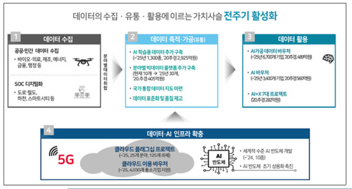 정부는 '디지털 뉴딜'의 핵심 사업으로 총 4991억원이 투입되는 '데이터 댐' 사업 지원을 받을 총 2103개 지원 대상 기관을 확정하고, '인공지능(AI) 학습용 데이터 구축' 사업 등을 통해 2만8000여개의 일자리가 창출될 것으로 전망했다.