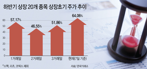 그래도 하반기 상장기업의 선례가 힌트가 될 수도 있다. 하반기 상장기업 20개(이하 스팩·리츠·코넥스 제외)를 분석한 결과 공모가 대비 첫날 종가 상승률은 57.17%로 상장 후 5거래일 중 수익률이 가장 높았다. 20개 종목 중 상장 첫날 종가가 공모가보다 낮은 곳은 미투젠, 브렌드엑스코퍼레이션, 더네이처홀딩스 단 3개에 불과했다.