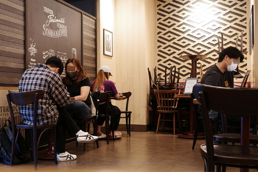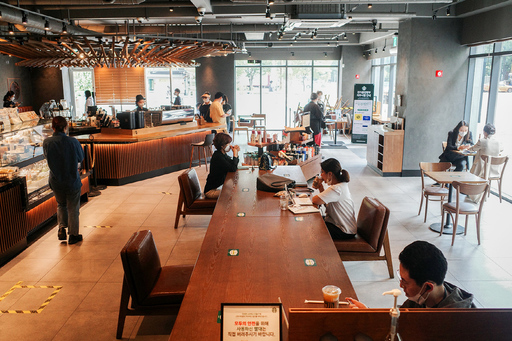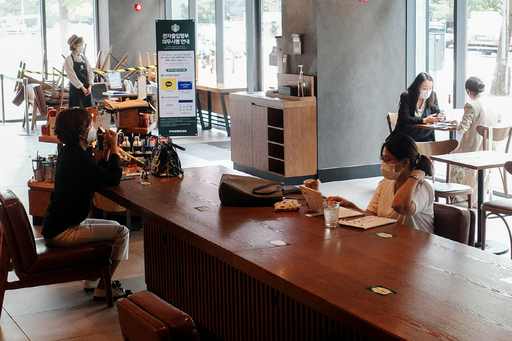 사회적 거리두기가 2단계로 격하되며 프랜차이즈 매장 내 취식이 재개된 14일 오전 서울 마포구 인근의 프랜차이즈 카페에서 이용객들이 매장 내 취식 하고 있다.