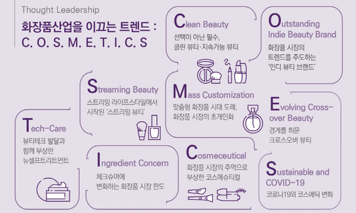 삼정KPMG는 급변하는 화장품 시장과 소비자에 대응하기 위한 화장품산업 주요 트렌드를 ▲기업의 윤리성과 진정성이 소비자의 제품 선택의 척도로 부상한 클린뷰티(Clean Beauty), ▲밀레니얼·Z세대의 새로움에 대한 호기심과 메이저 브랜드에 뒤처지지 않는 제품력을 무장한 아웃스탠딩 인디뷰티 브랜드(Outstanding Indie Beauty Brand) ▲제품을 구매·소유하지 않고 체험형 공간에서 경험하거나, 전문가 추천을 받아 뷰티 제품을 구독하는 스트리밍뷰티(Streaming Beauty) ▲ 개개인이 선호하는 취향과 피부 특성에 맞춰 만든 비스포크 화장품을 가능하게 하는 매스 커스터마이제이션(Mass Customization) ▲패션과 럭셔리 업종의 화장품 시장 진출이 활발하면서 경계를 허문 크로스오버 뷰티(Evolving Cross-over Beauty) ▲합리적인 가격과 편의성을 추구하며 집에서 스스로 관리하는 테크케어(Tech-Care) ▲착한 성분을 찾는 인그리디언트 컨선(Ingredient Concern) ▲화장품과 의약품의 중간 개념으로 기능성 화장품을 의미하는 코스메슈티컬(Cosmeceutical) ▲코로나19 팬데믹의 코스메틱 영향인 서스테이너블(Sustainable) 등 'C·O·S·M·E·T·I·C·S' 9가지로 조명했다.