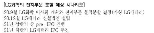 이날 LG화학은 긴급 이사회를 개최하고 기업가치와 주주가치 제고를 위해 전지사업부를 분할하는 안을 의결했다. 10월 30일 임시주주총회의 승인을 거친 뒤 12월 1일부터 배터리 사업을 전담하는 신설법인 'LG에너지솔루션(가칭)'을 공식 출범할 예정이다.