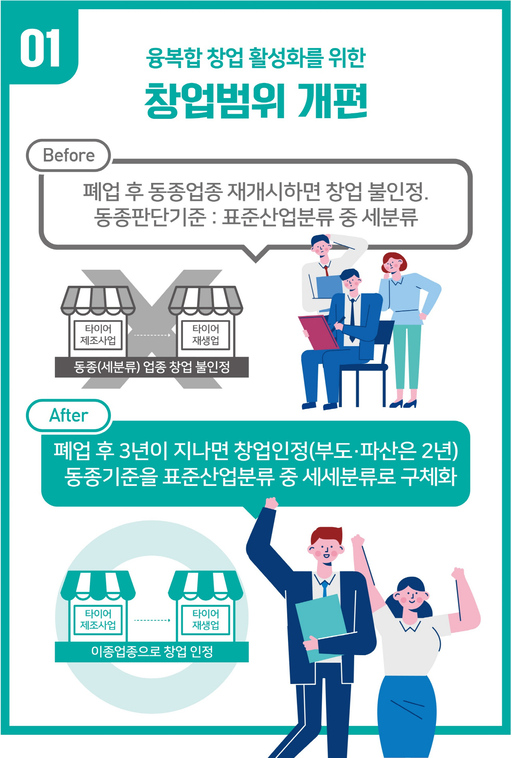 아울러 중소기업이 폐업 후 동종 업종으로 사업을 개시하면 평생 창업으로 인정하지 않았지만 3년(부도·파산은 2년)이 지난 후 사업을 시작하면 역시 창업으로 인정하도록 했다.
