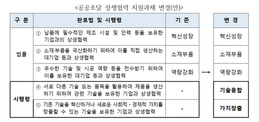 이는 대·중소기업간 상생협력을 통해 중소기업 혁신역량 및 소재·부품 기업의 판로를 촉진하기 위한 것으로 미국 연방 정부가 운영하는 '멘토-프로테제 프로그램'을 우리나라 조달시장 상황에 맞게 벤치마킹해 올해 1월부터 두 차례 공고를 통해 26개 과제(95개 제품)를 선정, 지원하고 있다.