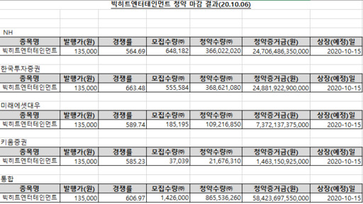 6일 금융투자업계에 따르면 이날까지 빅히트 청약을 진행한 증권사별 경쟁률은 ▲한국투자증권(663.48:1) ▲미래에셋대우(589.74:1) ▲NH투자증권(564.69:1) ▲키움증권(585.23:1) 순으로 높았다.