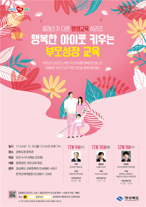 경북도는 오는 4일과 16일 그리고 12월 9일 저녁 7시마다 경북도청 동락관에서 자녀교육의 분야별 명사를 초청해 '행복한 아이로 키우는 부모성장교육'을 개최한다.
