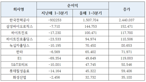 전년 동기와 비교하면 총 50개 기업이 적자에서 흑자로 전환하는데 성공했다. 한국전력이 올해 3분기까지 누적 순이익 1조5078억원을 기록하며 흑자전환 기업 중 1위를 차지했다. 9322억원의 적자를 기록했던 지난해 1~3분기보다 2조4400억원을 더 벌어들였다. 이어 삼성바이오로직스(1447억원), 하이트진로(1177억원), 하이트진로홀딩스(949억원), 녹십자홀딩스(704억원) 등이 1000억원 안팎의 순익을 올리며 흑자전환 명단에 이름을 올렸다.