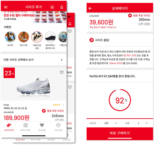 서비스 이용법은 간단하다. 펄핏 앱에 가입하면 우편으로 종이 키트가 배송된다. 종이에 발을 대고 펄핏 앱을 통해 사진을 찍으면, 인공지능이 발의 길이·너비·높이를 종합한 사이즈를 측정해준다. 또 펄핏에 입점한 브랜드 중 가장 적합한 사이즈의 운동화도 추천 받을 수 있다.