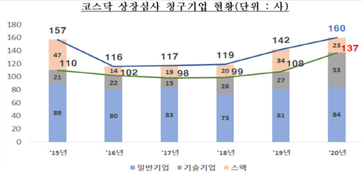 상장심사를 청구한 기업 수는 총 160사에 달했다. 스팩을 제외할 경우 137사로 집계됐다. 기술특례 청구기업이 늘어난 것이 주된 요인이다. 올해 기술특례 청구기업은 53곳으로 지난해(27곳)보다 2배 가까이 증가했다.