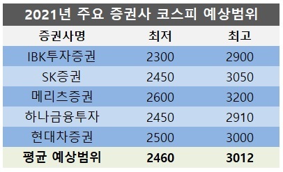 국내 주요 증권사 5곳의 리서치센터장이 제시한 2021년 코스피 평균 예상범위는 '2460~3012선'이다. 지수 최하단은 2300, 최상단은 3200이었다. 대다수 증권사들은 2021년 풍부한 글로벌 유동성, 실적 개선 등을 이유로 코스피지수가 3000선를 뛰어 넘거나 이에 육박할 것이라고 내다봤다.