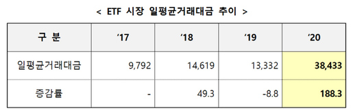 하루평균 거래대금이 폭발적으로 늘어난 것이 눈에 띈다. 지난해 일평균 거래대금은 2019년 1조3000억원에서 3조8000억원으로 188.3% 늘었다. 신종 코로나바이러스 감염증(코로나19) 여파로 코스피 지수가 연 최저점(1457.74)에 달했던 지난해 3월 19일엔 하루에 14조원 규모가 거래되며 사상 최고치를 기록했다. 2017년 9792억원에 불과했던 ETF 일평균 거래대금은 2018년 1조4619억원, 2019년 1조3332억원 등 들쭉날쭉한 흐름을 보이다 지난해 3조8433억원까지 3배 가까이 늘었다.