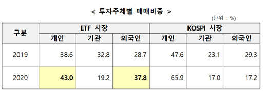 ETF 시장에 대한 외국인투자자의 관심이 높아진 것도 특징으로 꼽혔다. 지난해 코스피 시장에선 개인 비중이 47.6%에서 65.9% 수준까지 늘며 외국인 비중(29.3%→17.2%)이 크게 줄었으나, ETF 시장에선 개인(38.6%→43.0%)과 외국인(29.7%→37.8%) 모두 늘었다. 대신 기관투자자 비중(32.9%→19.2%)은 10% 이상 줄었다.