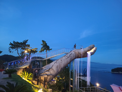 호텔에서 차로 5분 거리에 여수 예술랜드 소개: 국내 최대 테마형 AR 3D 트릭아트와 50m의 미디어 터널과 150m 인공 암반 동굴을 지나면 여수의 아름다운 바다를 배경으로 펼쳐지는 멋지고 환상적인 조각 공원을 즐길 수 있는 바다 전시장이다. 조각 공원 안에 익스트림 공중그네는 넓게 트인 바다와 절벽에서 짜릿한 스릴감을 안겨주는 익스트림 놀이기로 100m 상공에서 바라보는 환상적인 바다 풍경을 함께 감상할 수 있으며 목재 계단식과 투명 강화유리를 바닥에 설치하여 안전장치를 착용 후 아찔한 구름다리를 지나 짚라인도 탈 수 있는 스릴 넘치는 오션 스카이워크, 미다스 왕의 미다스의 손(Midas touch)에서 유래된 손 조형물로 여수의 아름다운 바다를 감상하며 소원을 기원하는 전망대까지 2~3시간 충분히 즐길 수 있는 예술테마파크이다.