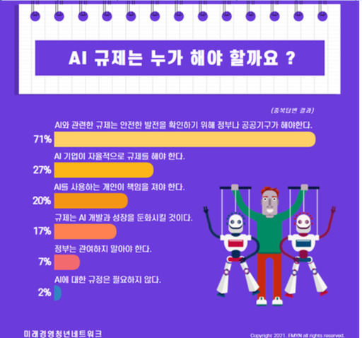 성규빈 미래경영청년네트워크 대표는 "'이루다' 논란으로 AI 윤리에 대한 공론화가 시작된 만큼, 인공지능을 윤리적으로 활용하기 위한 교육과 정책을 만드는 것이 시급하며, 정부나 교육기관에서 적극 참여해주길 바란다"며 "이루다 사건도 제대로 된 AI 윤리의식 없이 AI를 개발하면 위험하다는 것을 보여준 것으로, 이번 조사에서도 개발자와 기업에 대한 교육이 필요하다는 의견이 많았다"고 설명했다.