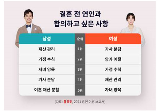 이런 가운데 미혼의 48.9%(복수응답)는 결혼 합의 사항으로 '가사 분담'을 강조했다. 가정 수칙(48.9%)과 재산 관리(43.7%)도 높은 비중을 보였다. 성별로 보면 남성은 ▲재산 관리 ▲가정 수칙 ▲자녀 양육 ▲가사 분담 순으로, 여성은 ▲가사 분담 ▲양가 예절 ▲가정 수칙 ▲재산 관리 차례로 우선하는 경향을 보였다.