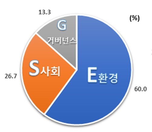 조사 결과에 따르면 ESG 중 가장 중요하다고 여기는 지표로 가장 많은 60.0%가 환경(E)을 꼽았다. 사회(S)와 지배구조(G)를 택한 비율은 각각 26.7%, 13.3%로 나타났다. 세부적으로는 기후변화나 탄소배출이 가장 중요하다는 응답이 26.7%로 가장 많았다. 이어 지배구조(17.8%), 인적자원관리(13.3%), 기업행동(11.1%), 청정기술·재생에너지(11.1%)가 뒤를 이었다.