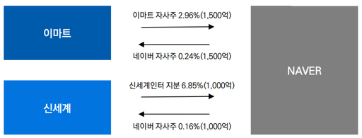 이마트는 자사주 82만4176주(지분 2.96%)를 네이버 주식 38만9106주(지분 0.24%)와, 신세계는 신세계인터내셔날 주식 48만8998주(지분 6.85%)를 네이버 주식 25만9404주(지분 0.16%)와 맞교환한다.