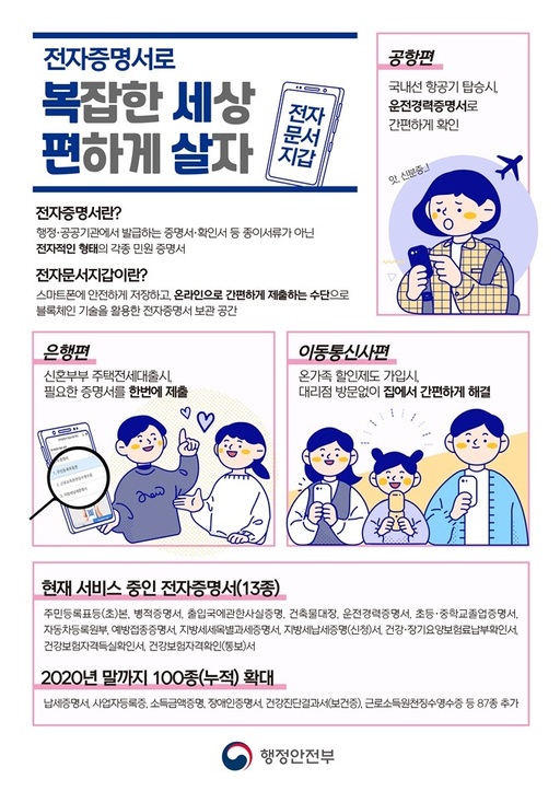 전자증명서·전자문서 지갑 시스템은 행정안전부가 2019년부터 디지털정부 혁신사업의 하나로 추진해 현재까지 주민등록 등·초본 등 100종의 민원서비스를 제공토록 구축됐으며, 2021년까지 300종으로 확대 운영할 전망이다.