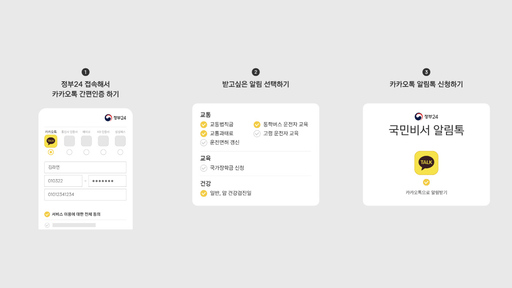 카카오는 29일부터 국민건강보험공단 건강검진 안내, 도로교통공단 운전면허 갱신 알림, 경찰청 교통 과태료 납부 안내 등 교통, 교육, 건강 등 3개 분야 8종의 국민비서 알림 서비스를 시작한다.