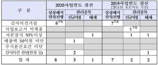 이날 한국거래소 유가증권시장본부가 2020사업연도 12월 결산법인의 사업보고서를 심사한 결과 12월 결산 상장법인 총 767사(외국법인, 분할재상장 제외) 중 12사에 대해 시장조치를 했다고 설명했다.