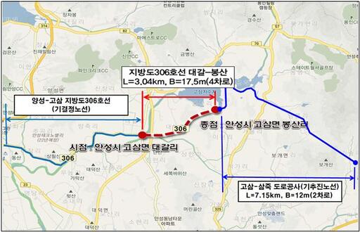 대갈~봉산간 신설도로는 김보라 안성시장의 공약사항으로 기존 지방도306호선과 경기도에서 추진 중인 고삼-삼죽 간 도로를 연결하는 노선으로, 세종~포천고속도로(안성바우덕이 휴게소)와 용인반도체 클러스터 일반산업단지 등을 고려한 안성시 장래 체계적 교통망을 구성하여 지역 간 이동성 및 안성시 북부지역 성장에 장기적 간선 축 기능을 위한 노선이다.