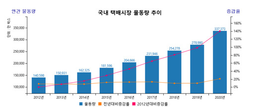 6일 물류업계와 한국통합물류협회에 따르면 지난 2012년 당시 연간 14억598만 박스였던 택배 물동량은 이후 빠르게 늘면서 2020년엔 33억7373만개로 8년 동안 120%나 증가했다. 같은 기간 국내 택배시장 매출액도 3조5232억원에서 7조4925억원으로 112.7% 늘었다.